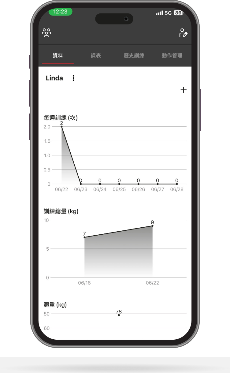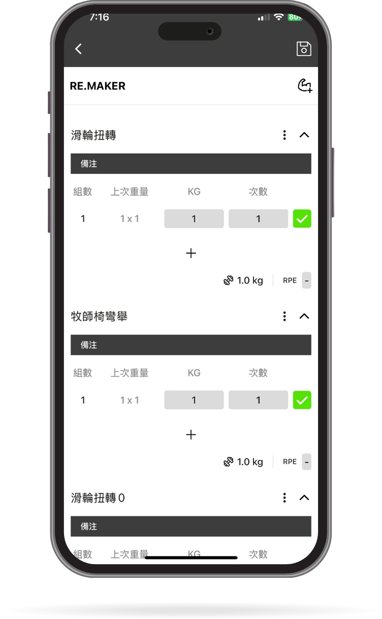 自訂模組、自由儲存進度、自定義動作、完整身體評估、RPE、自訂模組、熱身組、超級組、多人紀錄、左右分邊、訓練後即時對比、進階圖表、課表代碼、雙人同時紀錄、課表圖檔匯出、傷害評估系統、疲勞監控系統。